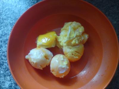 Hier sehr ihr 5 Dotter. Nach Pancakes, Makronen und Kuchen sind diese 5 Übrig geblieben. Ich habe sie in eine Tasse gegeben, darauf geachtet, dass sie nicht kaputt gehen, dann mit kochendem Wasser aus dem Wasserkocher übergossen und für 1-2 Minuten in der Mikrowelle gegart. (Deckel drauf! die können platzen!)