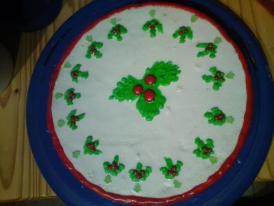 Hier sehr ihr einen Weihnachtskuchen. Es sind 2 Bisquitschichten, in der Mitte eine Schoko-Zimt-Creme. Die Eiweißcreme habe ich dann über den Kuchen gezogen und anschließend eingefärbt und als Stechpalmen aufgespritzt. Die Tannenbäumchen sind Zuckerstreudekor, die man fertig kaufen kann.